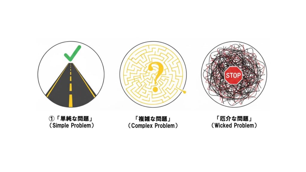 「複雑な問題」は、複雑で問題も解決策も明らかではないが時間ともに明らかになるもの。